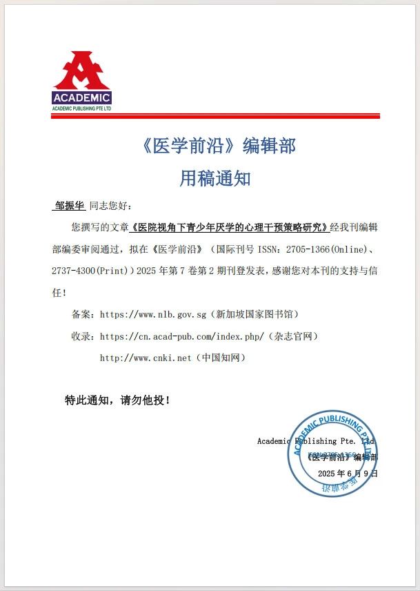 該項研究成果證實了結構化心理干預在醫(yī)院場景下應對青少年厭學問題的有效性與可行性,為臨床心理服務體系優(yōu)化提供了實證依據(jù)。未來需進一步探索干預要素的精準化配置、長期效果追蹤及多機構協(xié)作模式,以推動青少年心理健康服務的專業(yè)化與系統(tǒng)化發(fā)展。